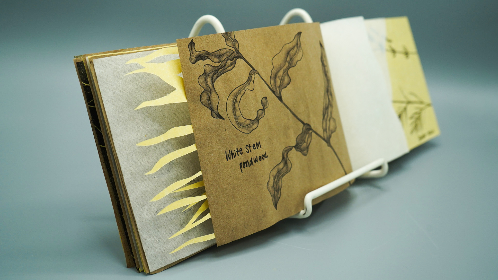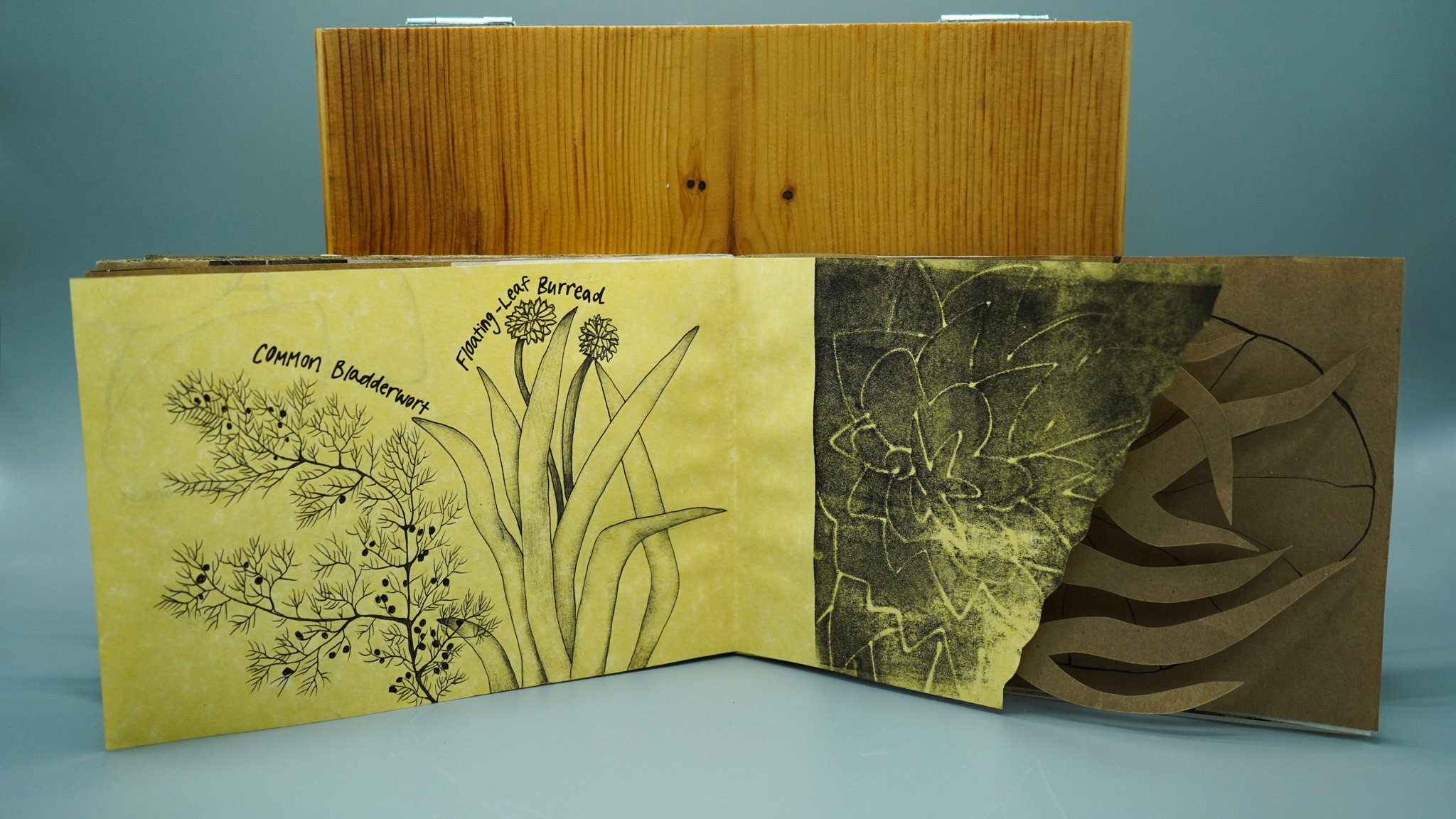 This book represents the five macrophyte, or aquatic plant, communities present in Wisconsin lakes, as defined in the 2017 National Lakes assessment conducted by the Wisconsin DNR. Rather than a scientific handbook, it is an artistic interpretation meant to highlight the beauty of these plants, many of which are very common and often overlooked. The book is meant to be held, flipped through, and interacted with, so feel free to take it out of the box!