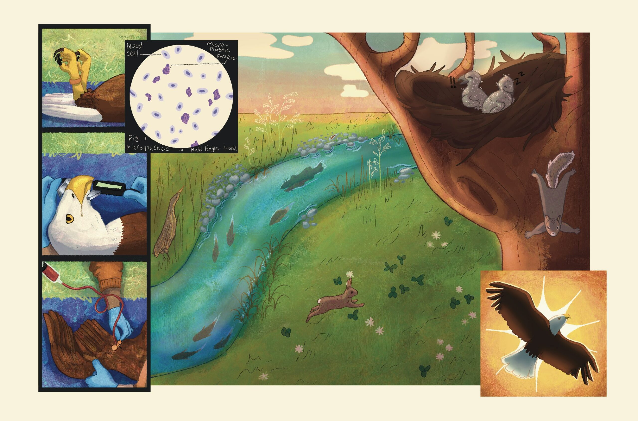 All things are interconnected, and nothing can exist outside of itself. I was tasked with exploring this idea, how water connects ecosystems, and how the water that surrounds us carries contaminants. These contaminants, small as they are, have a massive impact on the ecosystems they infect. They travel, through the water, onto plants, into fish, moving their way up through food chains in a sickening show of power. They reach the top of the food chain, in this case, a Bald Eagle, and infiltrate the predator’s bloodstream. Obviously, this impacts the animal’s health, and the death of a predator is the death of an ecosystem. Prey animals overtake the area, primary producers are all but devoured, and a once beautiful biosphere is depleted. Maintaining clean ecosystems is lifesaving, and tracking the movement of contaminants is the first step.