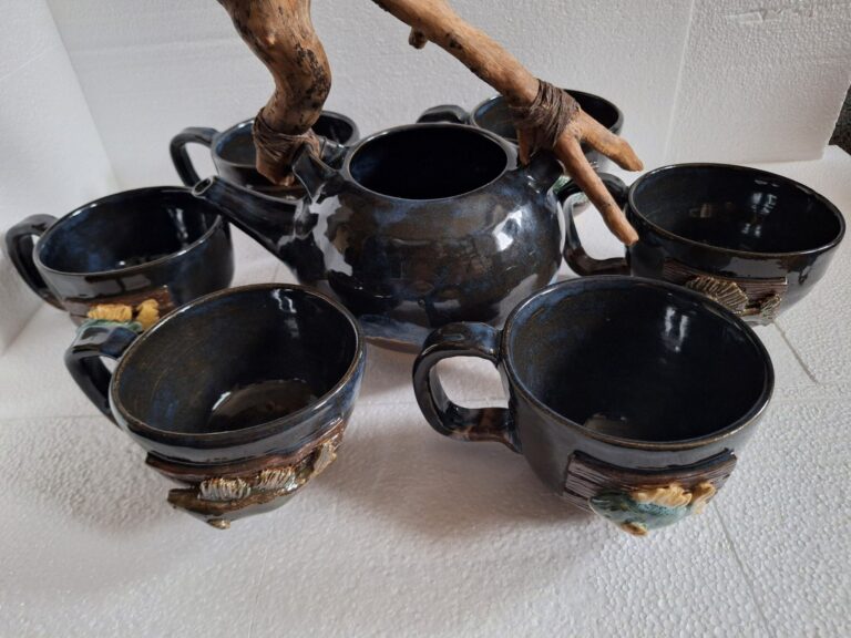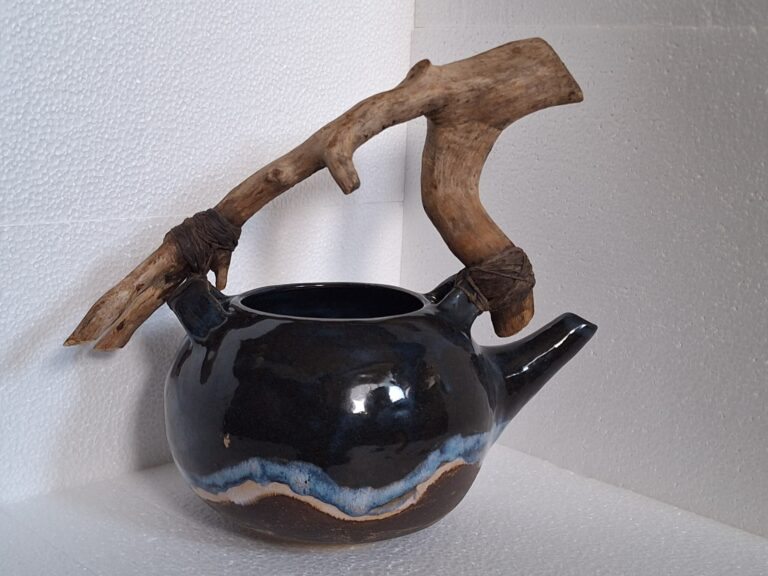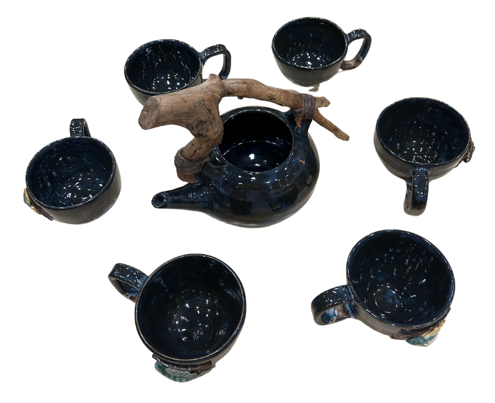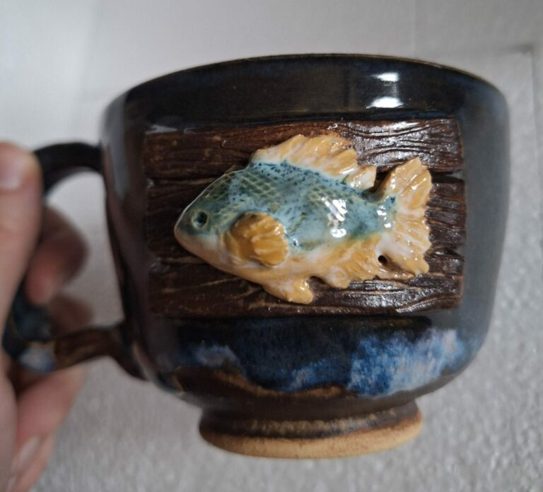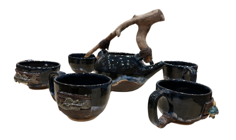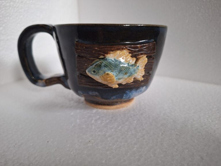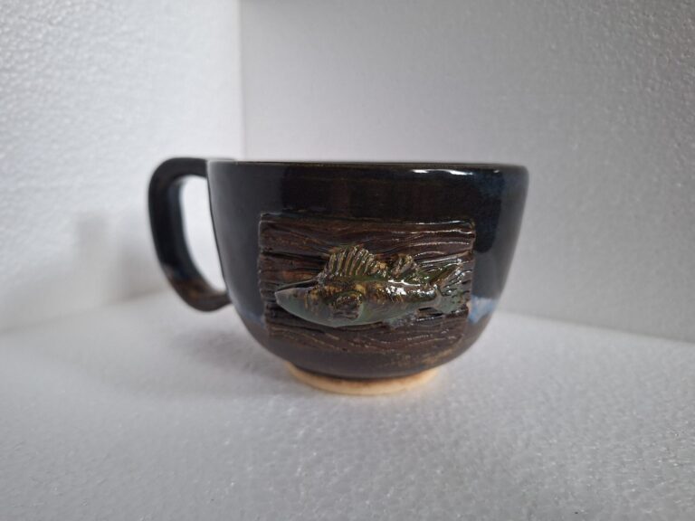 Lonnie’s work is all about communicating with anglers—understanding what they hope for while fishing and helping to bridge their connection with the water. I imagine her role much like a teapot, with the anglers as mugs. A teapot holds warmth, potential, and something to share, but without a mug, it has nowhere to pour its gift. Likewise, a mug is designed to receive, enhancing the experience of the tea, yet it depends on the teapot to be filled. While each can stand alone, they truly flourish when brought together. The inconsistent nature of each of the mugs I think highlights the differences we all have, and while all anglers are connected by a common goal of fishing, they have each have slightly different preferences and methods for doing so. To create this piece, I threw and trimmed each piece on the pottery wheel, sculpted and added the fish and ceramic handles, and went in search for a suitable wooden handle. The pieces were then fired, glazed, and fired again.