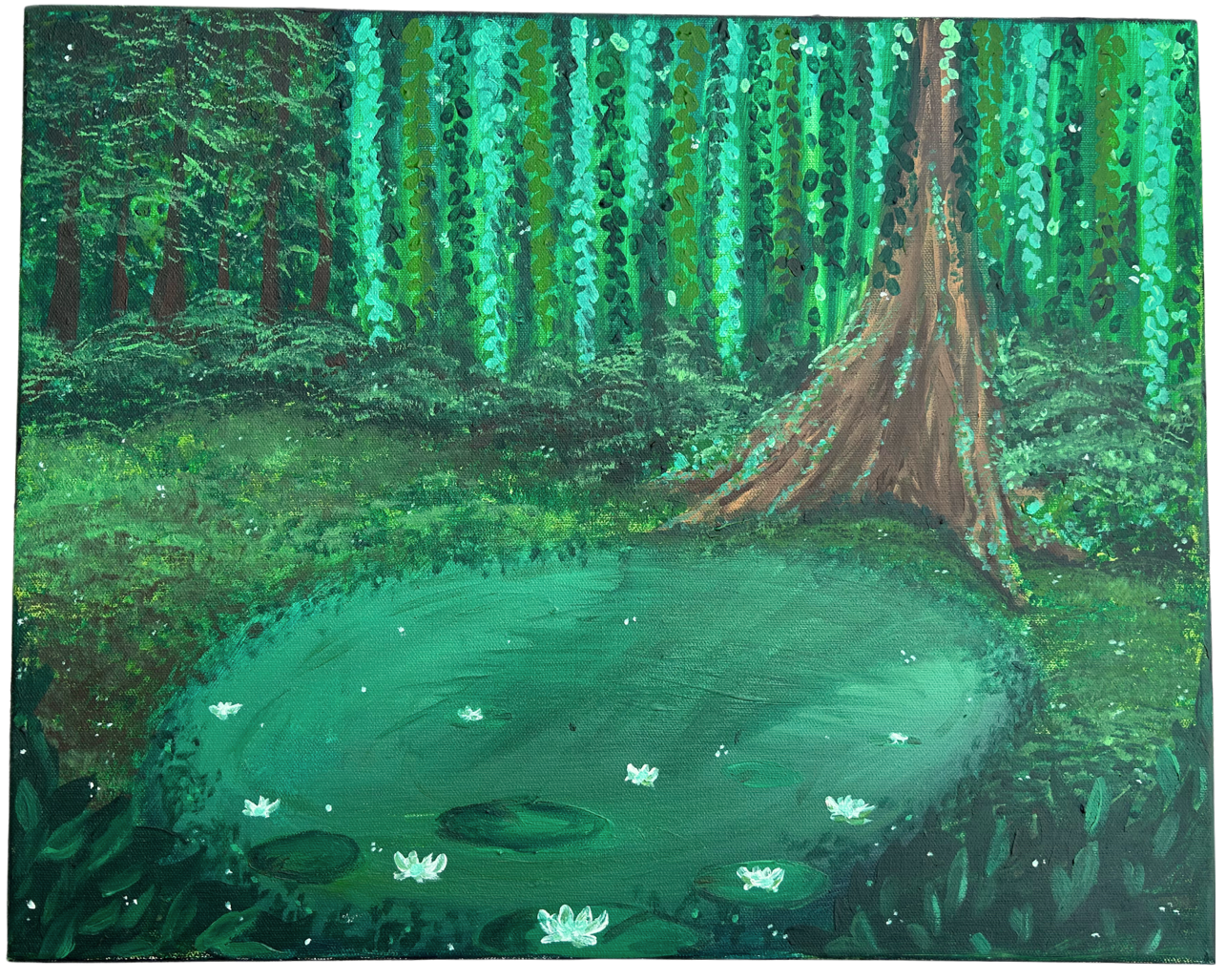I was inspired by the beauty of water and importance of marshlands. It is not well known, but water is often required for acrylic paint, and by using the inspiration as a physical tool, I was able to capture some of the beauty and give a piece to the viewer. I took advantage of water’s natural properties equal with the paint, representing the harmony it shares in the real world and the careful balance it takes. I used many layers, light washes of color, and allowed the water to take the paint where it wanted, working evenly. It’s a gentle dance that truly allowed me to capture the playfulness and beauty in every way possible, using the process to represent the delicacy it takes to keep our land even.
