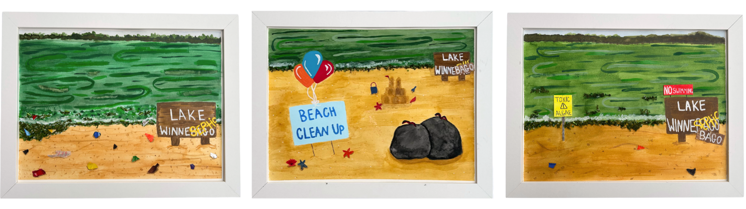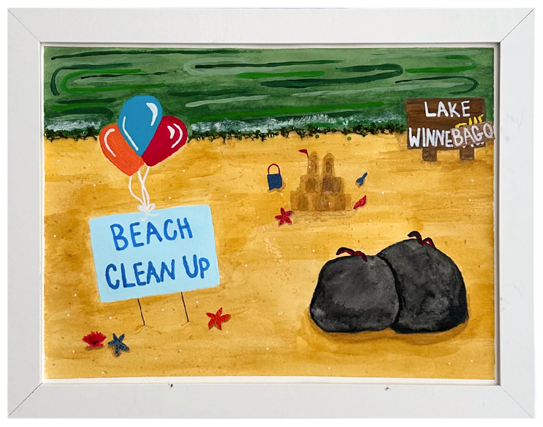 9″ x 12″ Watercolor, pieces of trash, beads, acrylic paint, faux seaweed, paint pens, markers In Collaboration with Taylor Hamblin, Assistant Professor of Social Studies Education, UW La Crosse