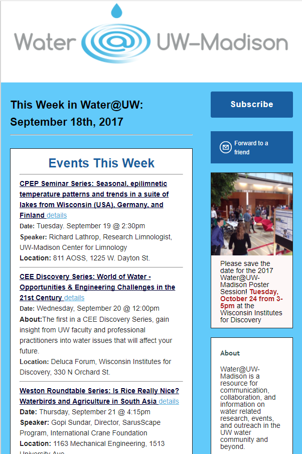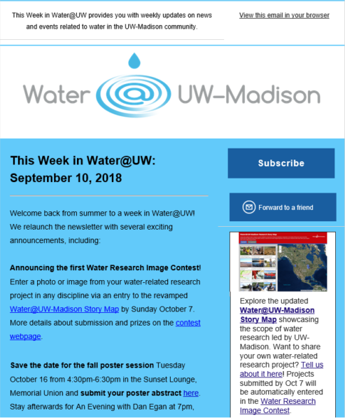Water@UW-Madison’s weekly newsletter “Tap In” informs readers on water related news, events, and opportunities happening around campus and beyond. It is the best way to stay updated on upcoming Water@UW-Madison events and to stay connected to the Water@UW community! To sign up, or if you have water-related events or opportunities you would like to see featured in an upcoming newsletter email us at water@mailplus.wisc.edu.